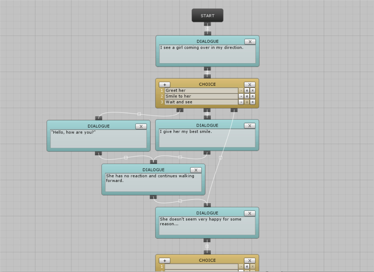 Thus, the first challenge I set myself was to create a node-based editor to make it possible for me (and more importantly, for my partner) to write dialogue scenes in a simple, visual fashion. I know such a system already exists in the Asset Store, but it's paid, and I don't like how it works, and I couldn't just build a game for someone else's scripts and call it mine anyway. So I gathered my courage and well, I made it. It's quite crude by the time I'm writing this, but the basic concepts are there. You can create dialogue boxes, connect them in the order you want them to appear. And more importantly, it all converts into game logic which make the scene unfold exactly like you've set it up when you run the program. To be honest, I was surprised it actually worked (almost) at first, with so few bugs. :p So I'm quite proud of my work. :)
