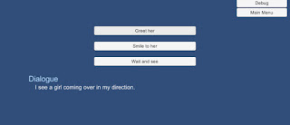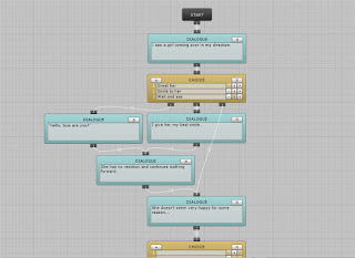 In my post about the Tone Wheel, I told you how the point was to give the player some intiative potential, that is, to allow them to start things, instead of always waiting to be prompted by NPCs. Well then, I thought, there are two people in a conversation (that is, at least two), and if one is always responding to what the other produces, this makes for a poor experience. So, the conversation is just getting started, you get to choose a conversation topic. The girl reacts to what you had to say about it. And then, the girl chooses another topic of her own to continue the conversation. You react to what she said, then it's your turn to choose a topic again.